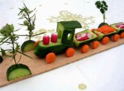 Creatief met fruit en groente: Er zijn vele leuke ideeen op het internet te vinden. Laat de kinderen helpen bij het uitzoeken en het maken van een boom, diertje of trein. Succes gegarandeerd. Neemt u anders een kijkje op mijn Pinterest pagina.
